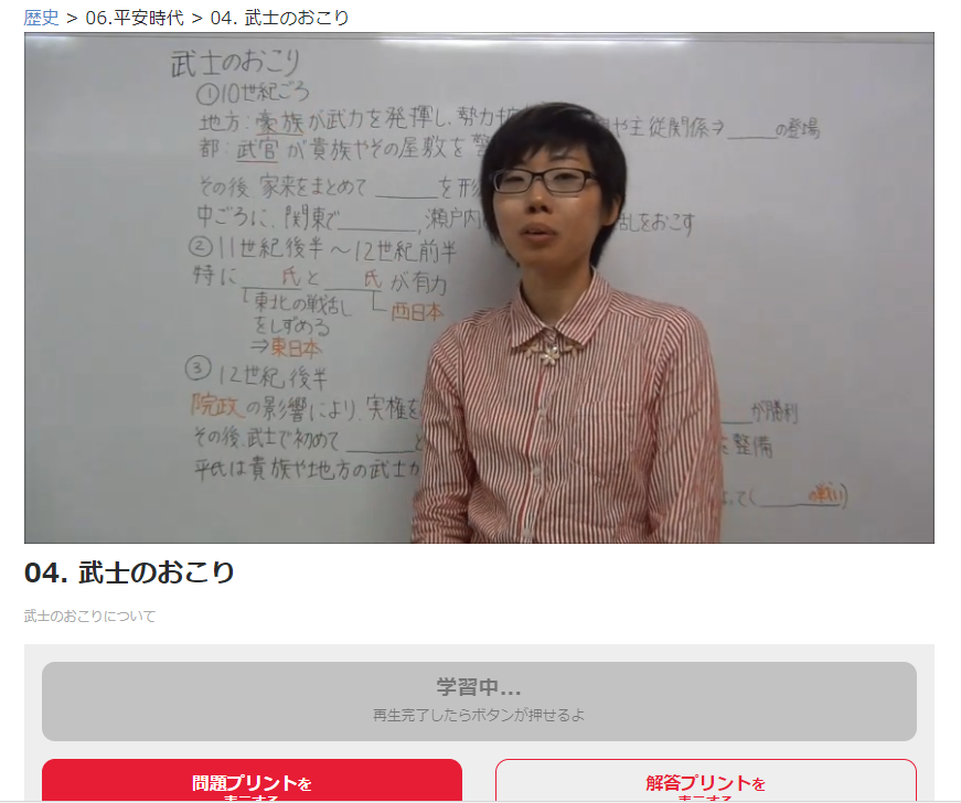 こんにちは塾長の中嶋です。八戸三社大祭は今日の後夜祭で終了ですね。さて、今日は中学3年生の社会の受験勉強にやり方のヒントについて少し紹介したいと思います。社会は地理、歴史、公民の科目がありますが、八戸市の中学校ではまだ公民に入っていないことが多いので夏休み中は歴史と地理の総復習をすることをお勧めします。社会が苦手な方は重要語句が暗記できていないことが多いので重要語句を総暗記です。塾は一問一答形式のドリルを使用しています。ただし、ただ英単語のように暗記していると背景や流れなどつながりで覚えられずに実際に実力テストではなかなかいい点数がとれないです。そこでお勧めしたいのは、自宅で勉強する際は教科書を読むことをお勧めします。例えば一問一答で鎌倉時代を暗記したら、鎌倉時代の教科書の内容を読む。このことで知識が深く広くなっていきます。塾では写真のように映像授業が1コマ5分程度にまとまっているので、鎌倉時代の映像授業を受講することで理解力が増えます。苦手な方はぜひ、このやり方をお勧めします。得意なお子様は、問題演習を通じて知識の確認がベストです。問題を解いて丸つけして、間違った箇所を暗記です。その際もただ暗記ではなく、間違えた語句の意味の再確認や正しい答えの根拠や時代背景などなど一緒に確認することで知識が増えます。この時期は知識を増やすことに注力して欲しいと思います。歴史も地理も勉強量とテストの点数は比例します。ぜひこの夏まだ残り2週間ありますので前向きに勉強してみてはいかがですか?