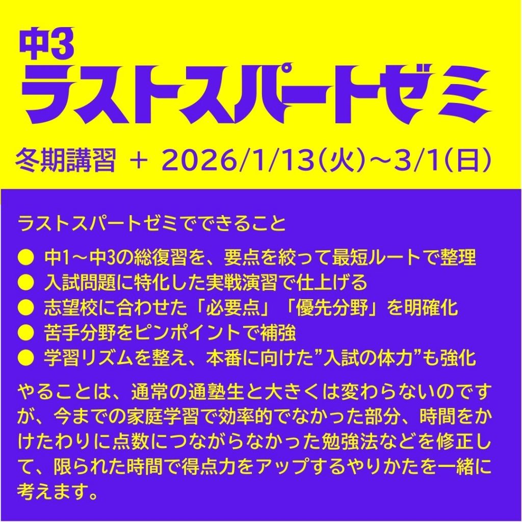 勉強ナビでは、冬休み中の「冬期講習」と1月からの 「中3ラストスパートゼミ」 で、塾生一人ひとりを本番まで全力でサポートします。