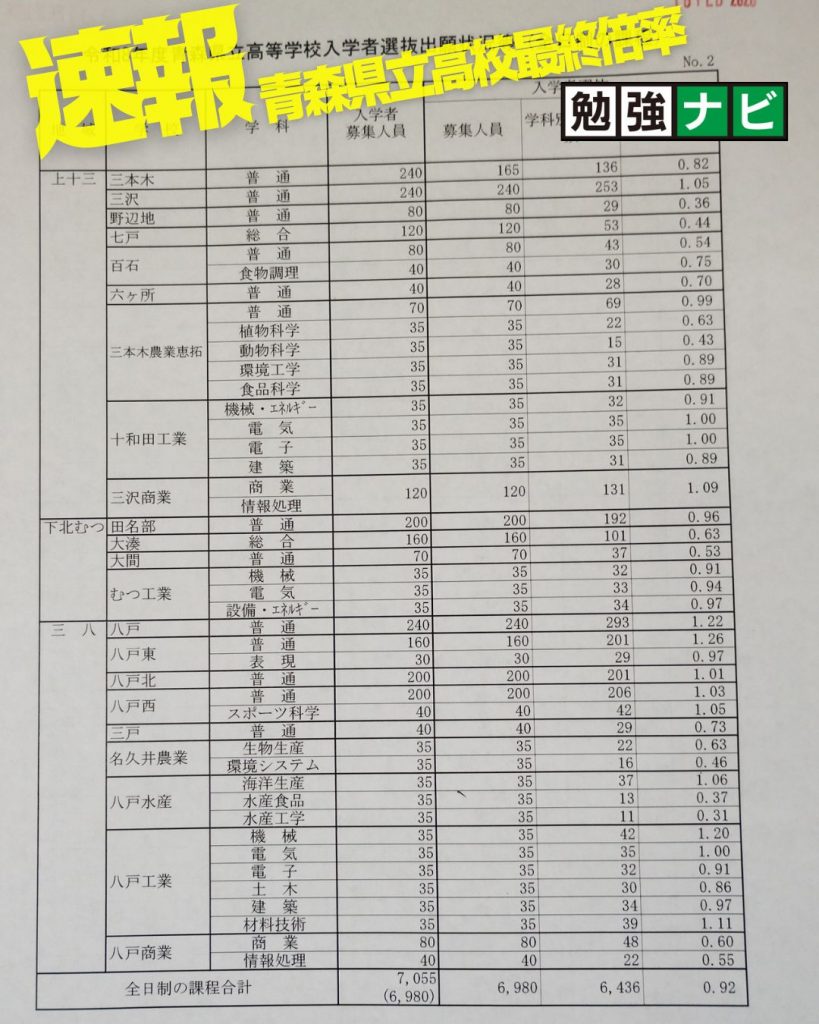 令和3年度青森県立高校入試志望倍率(第2次調査)-青森県教育委員会発表