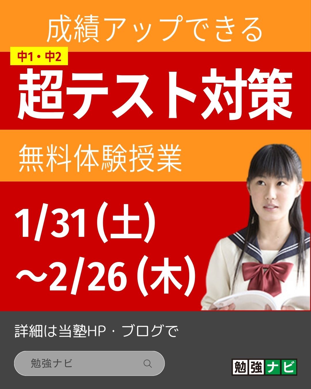 ★ 2月の考査に向けて、勉強ナビでは「超テスト対策」を実施します(中1・中2) ★