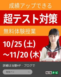 間もなく11月がやってきます。 11月と言えば、中3生は 実力テスト・全県テスト・3次考査 の「三大テスト」があります。12月上旬の三者面談に向けて、志望校決定前の最後の腕試しです。 中1生・中2生は 3次考査 だけです … 続きを読む ★ 11月の考査に向けて、勉強ナビでは「超テスト対策」を実施します ★